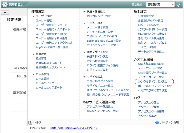 管理者設定>システム設定>シングルサインオン設定リンクを押します。