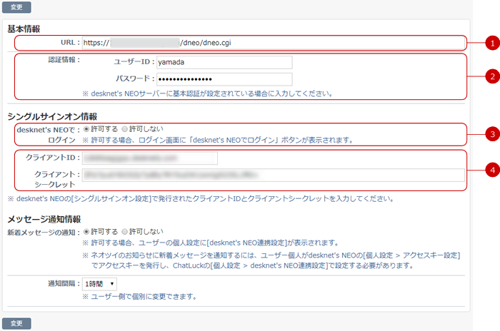 ChatLuckのシステム管理者設定で、 desknet's NEO連携情報を入力します。