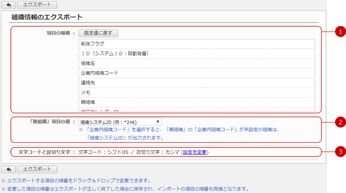 desknet's NEO 管理者設定>運用設定>組織情報のエクスポート リンクを押すと、組織情報のエクスポート画面が表示されます。