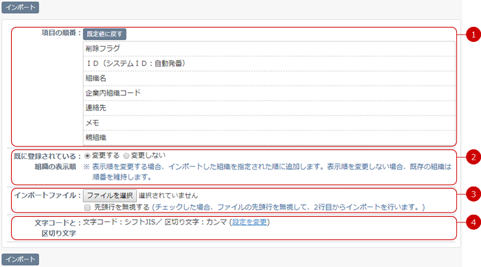 左側のメニューから運用管理>組織管理>インポートリンクを押すと、組織のインポート画面が表示されます。
