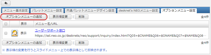 オプションメニュー設定の[オプションメニューの追加]ボタンを押します。