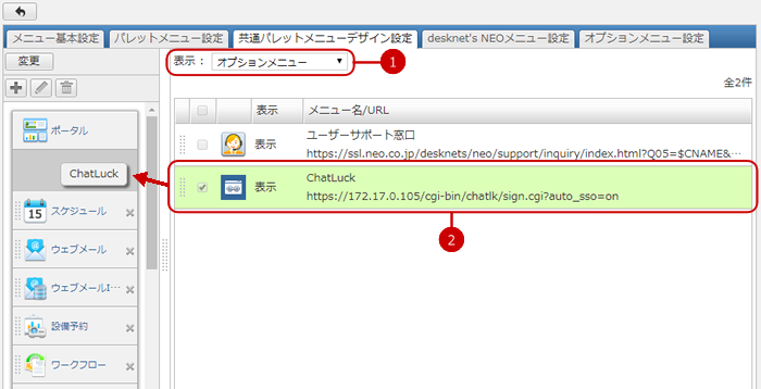 - ChatLuckのオプションメニューをドラッグ&ドロップでパレットメニューに追加します。