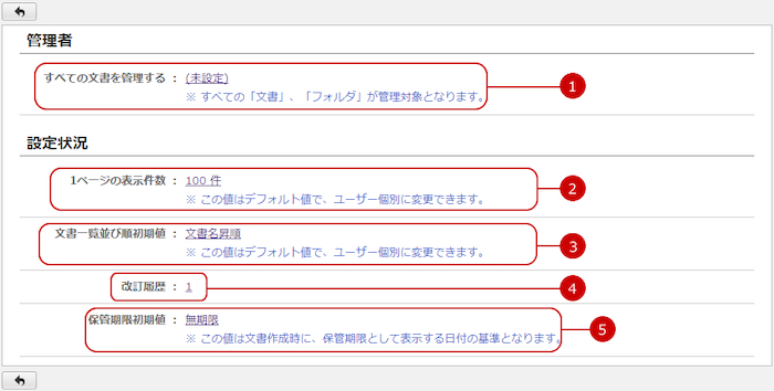 文書管理の各種設定の設定状況を確認できます。