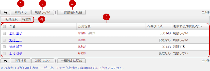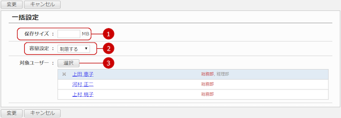 容量設定画面の[一括設定に切替]ボタンを押すと、複数のユーザーに容量設定を行う画面が表示されます。