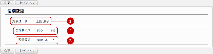 容量設定画面の氏名のリンクを押すと、容量設定の個別変更画面が表示されます。