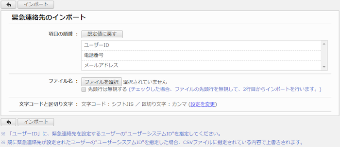 また、緊急連絡先のインポート機能によりファイルから一括して登録・変更することができます。