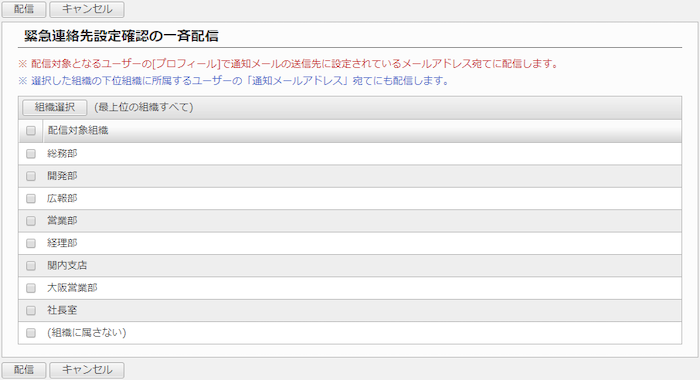 [配信]ボタンを押すと、選択した組織(下位の組織を含む)に所属するユーザーの緊急連絡先宛に安否確認メールが一斉配信されます。