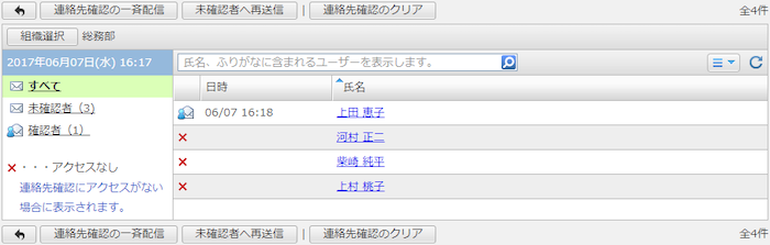 メールから接続確認があったユーザーの状況は、安否確認の緊急連絡先の確認メール配信画面から把握できます。