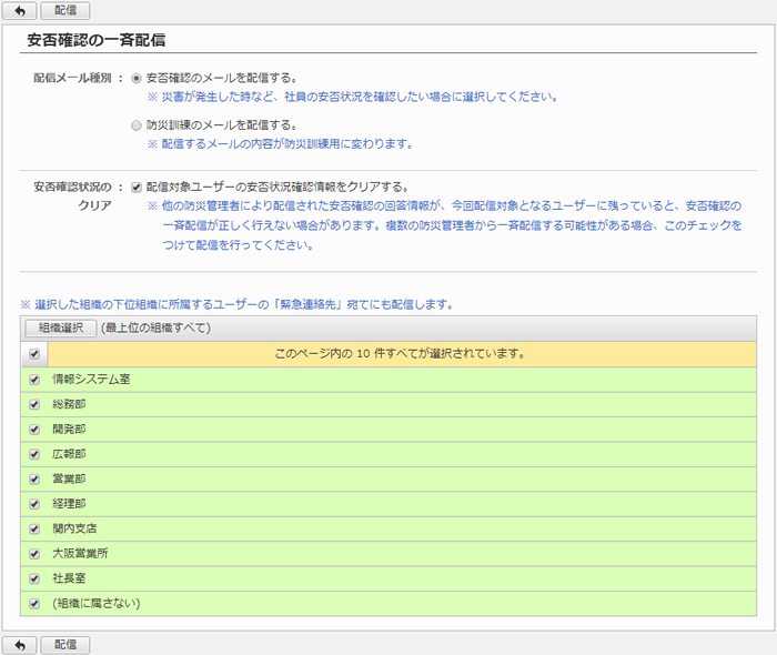 安否確認機能の設定メニューから[機能管理]-[安否確認の一斉配信]のリンクを押すと、安否確認の一斉配信画面が表示されます。