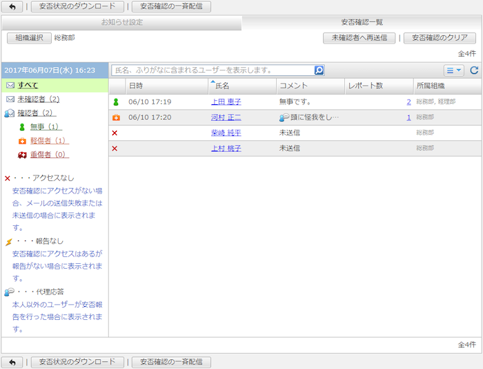 ユーザーが安否状況を報告すると、安否確認一覧画面に安否状況やコメントが表示されます。
