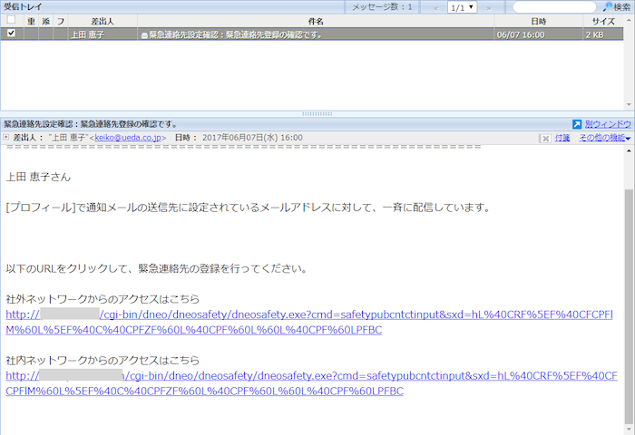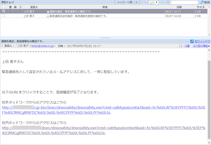 メールに記載されているURLに接続すると、緊急連絡先に設定したメールアドレス宛に正しくメールが受信できたことを管理者に報告します。