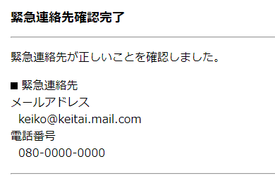 確認メールを受信したユーザーがメールに記載されているURLにアクセスすると、緊急連絡先の確認完了画面が表示されます。