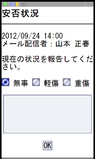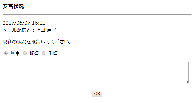 配信された安否確認メールより、各ユーザーが安否状況の報告を行います。
