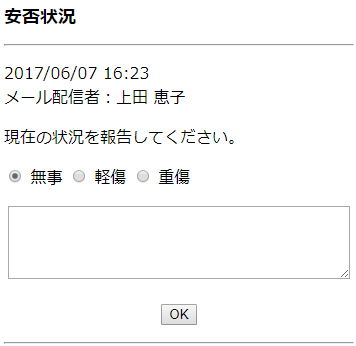 安否確認メールに記載してあるURLを押すと、安否状況の報告画面が表示されます。